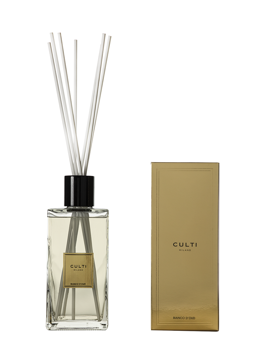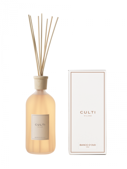 Flaconi di vetro satinato con tappo in acero naturale, vestiti da etichette in colore avorio. L'estetica della linea CULTI STILE evoca purezza ed eleganza. Bianco D’Oud: un’antica piazza illuminata da luci colorate, attraversata da persone iperconnesse, all’ultima moda, veloci. Tradizione e modernità si intrecciano creando le luci e le ombre che rendono immortale il fascino dell’Oriente.