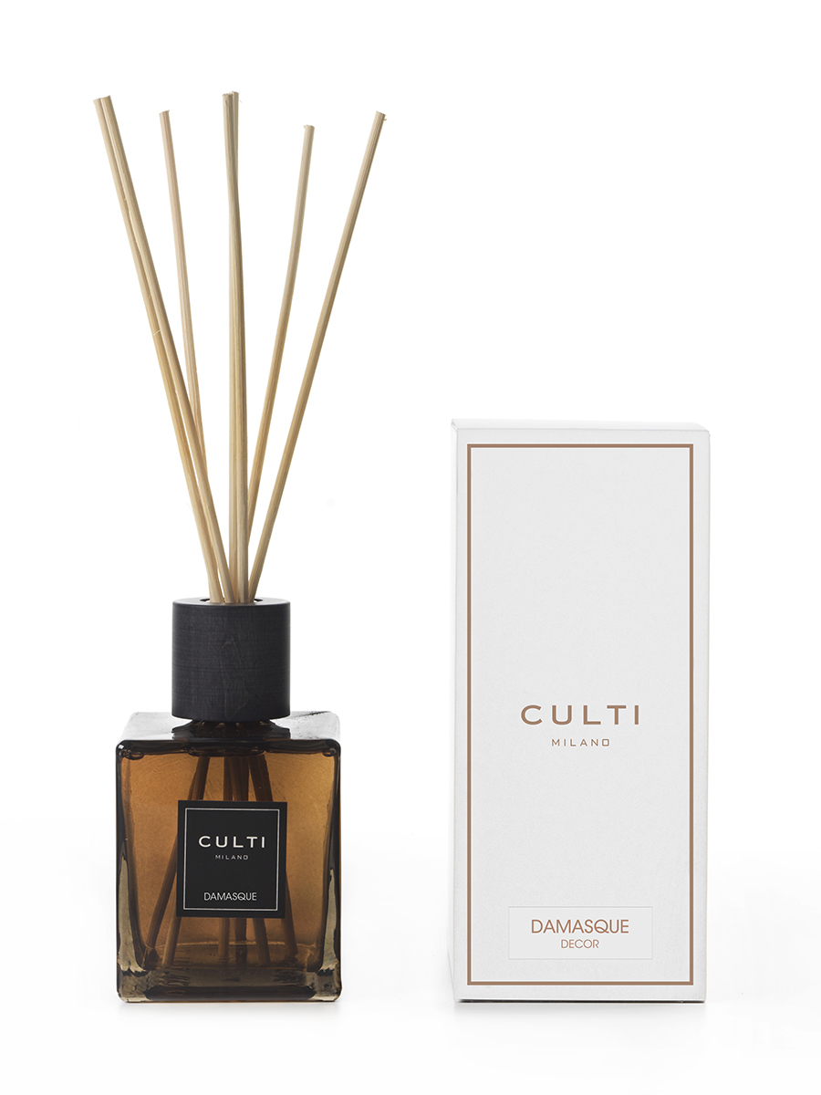 Flaconi di vetro con tappo in acero naturale, vestiti da etichette in colore avorio. L'estetica della linea CULTI STILE evoca purezza ed eleganza. Damasque: Un pesante mantello di pregiato damasco ritrovato in un baule, regale e prezioso. Un tessuto nobile e finemente lavorato da apprezzare in tutte le sue trame.