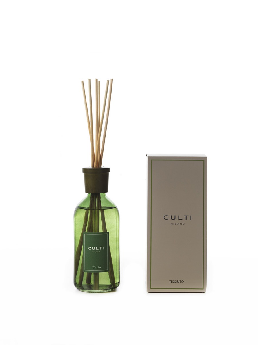 Flaconi di vetro trasparante colorato con tappo in acero verniciato Verde e vestiti da etichette colorate. La linea CULTI COLOURS è una deliziosa ventata di energia che dà vita ad ogni spazio. Thé: immergersi nel tepore meditativo di una vasca da bagno colma di thé verde giapponese. I vapori dell’acqua salgono ipnotici e diffondono delicatamente l’aroma delle foglie, impregnando l’ambiente.